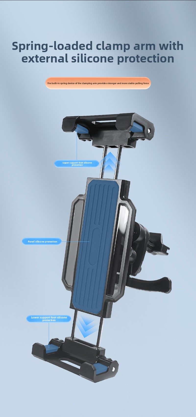 Crafted from premium ABS material and reinforced with metal inner components, it combines durability with a sleek, low-profile design. The adjustable clamp features soft silicone and sponge padding to protect your device from scratches while ensuring a strong, vibration-resistant grip. With a fully extendable arm length of 270mm and 360° rotation capabilities, you can easily achieve the ideal viewing angle in any setting.