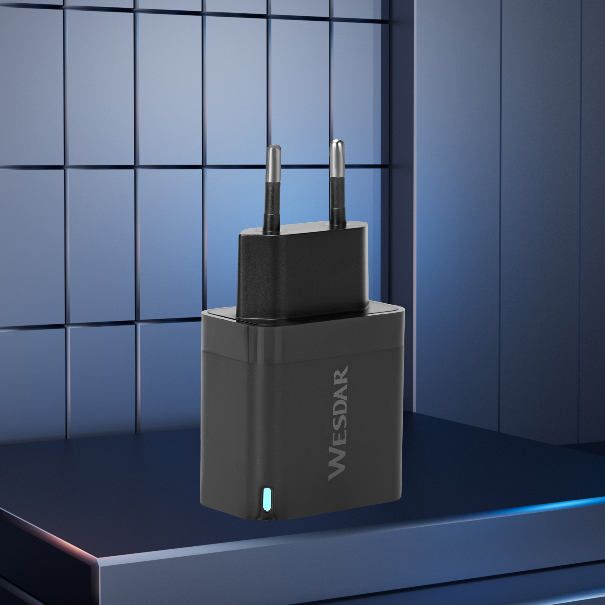 Meet the WESDAR 30W GaN Wall Charger, engineered with advanced Gallium Nitride (GaN) technology to deliver powerful, efficient charging in a remarkably compact design. Significantly smaller and cooler than traditional silicon chargers, it provides rapid PD3.0 and QC3.0 charging for your smartphone, tablet, and other devices through its dual USB-C and USB-A ports. The certified EU plug ensures safe, reliable power for your daily needs.